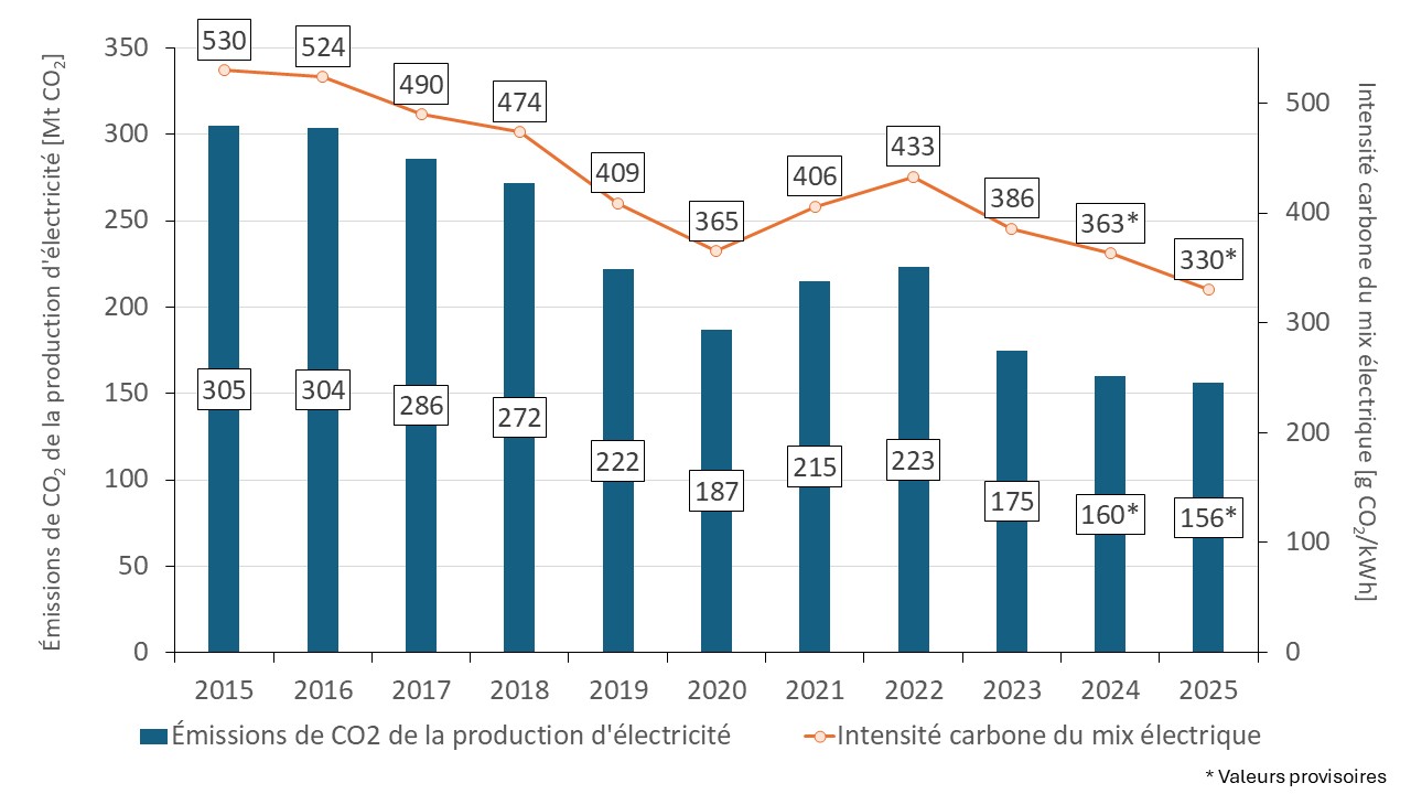 L’intensité carbone (lissée sur l’année) de la production d’électricité est estimée à 330 g CO2éq/kWh en 2025 (UBA 2025b ; BDEW 2025a).