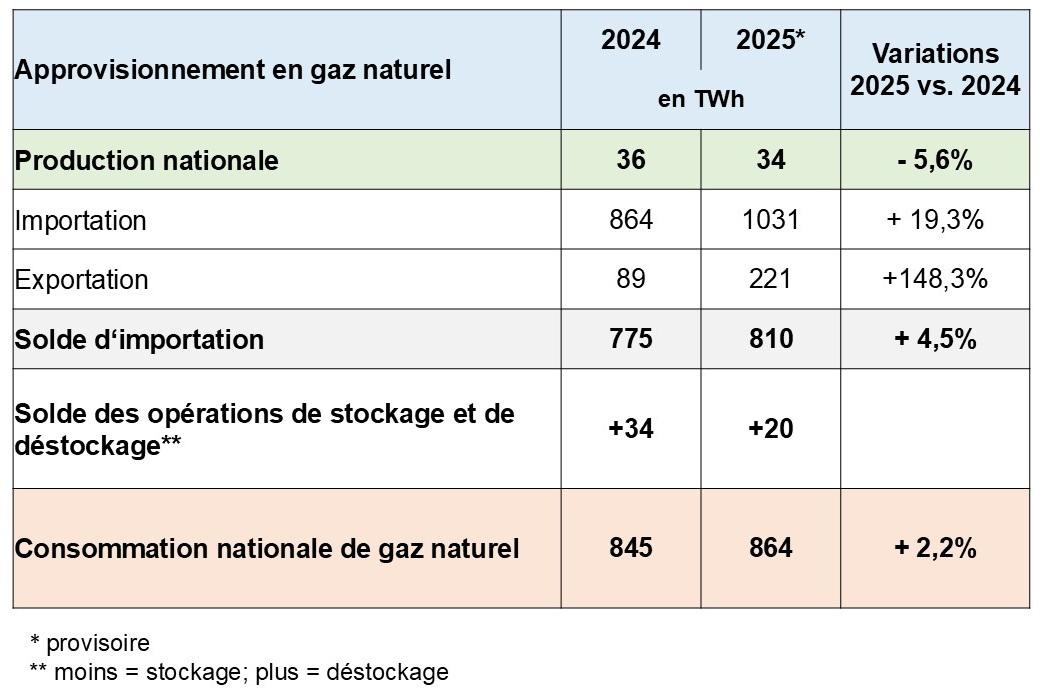 La consommation de gaz naturel a augmenté de 3,6% en 2025 par rapport à 2024 principalement en raison de la hausse de consommation de chaleur et de l’accroissement de la production d’électricité des centrales à gaz (production éolienne inférieure aux attentes par suite des conditions météorologiques défavorables au cours des premiers mois de 2025).