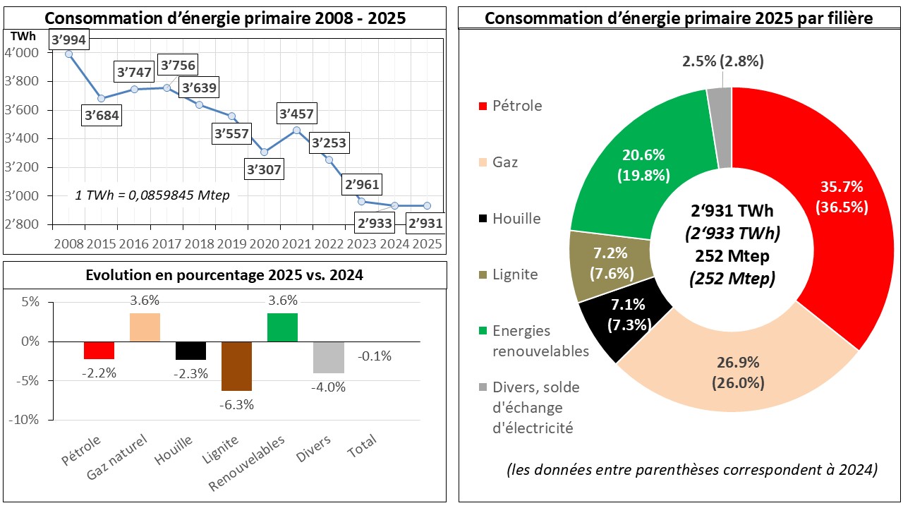 Selon le cabinet AG Energiebilanzen (AGEB 2025a) la consommation d’énergie primaire s’élève à 2931 TWh ou 252 Mtep (2024 : 2933 TWh ou 252 Mtep).