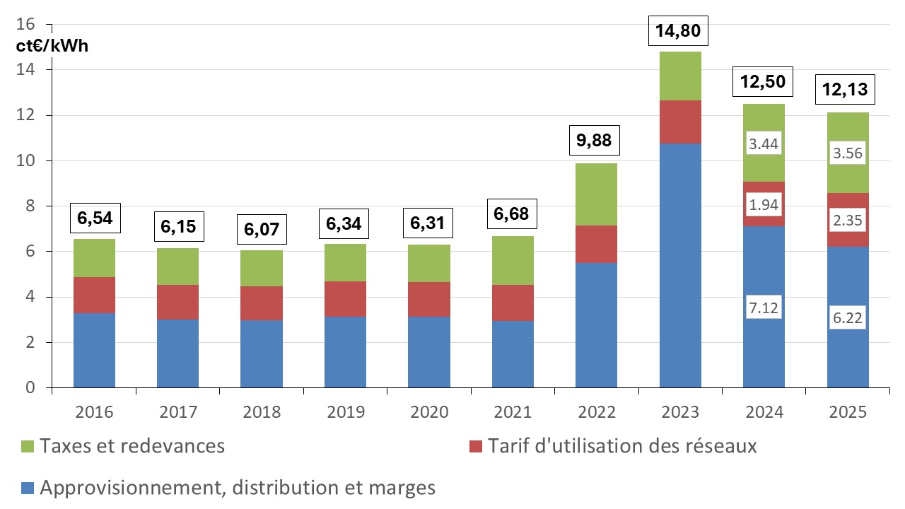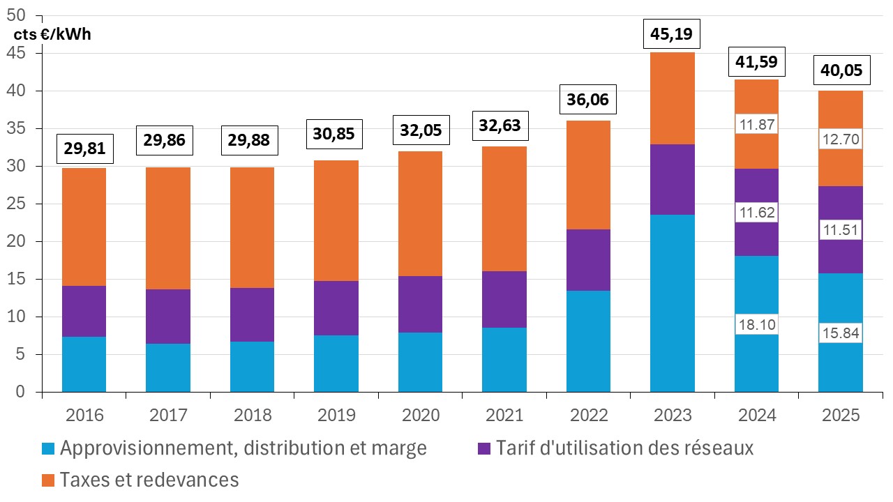 En 2025, les clients résidentiels ont pu profiter de la légère baisse des prix pour l’approvisionnement et la distribution. Mais cette baisse a été contrecarrée en grande partie par l’augmentation du tarif d’utilisation des réseaux et les taxes et redevances. Ces deux postes ont augmenté de presque 10% par rapport à 2024, en passant de 5,38 ct€/kWh à 5,91 ct€/kWh.