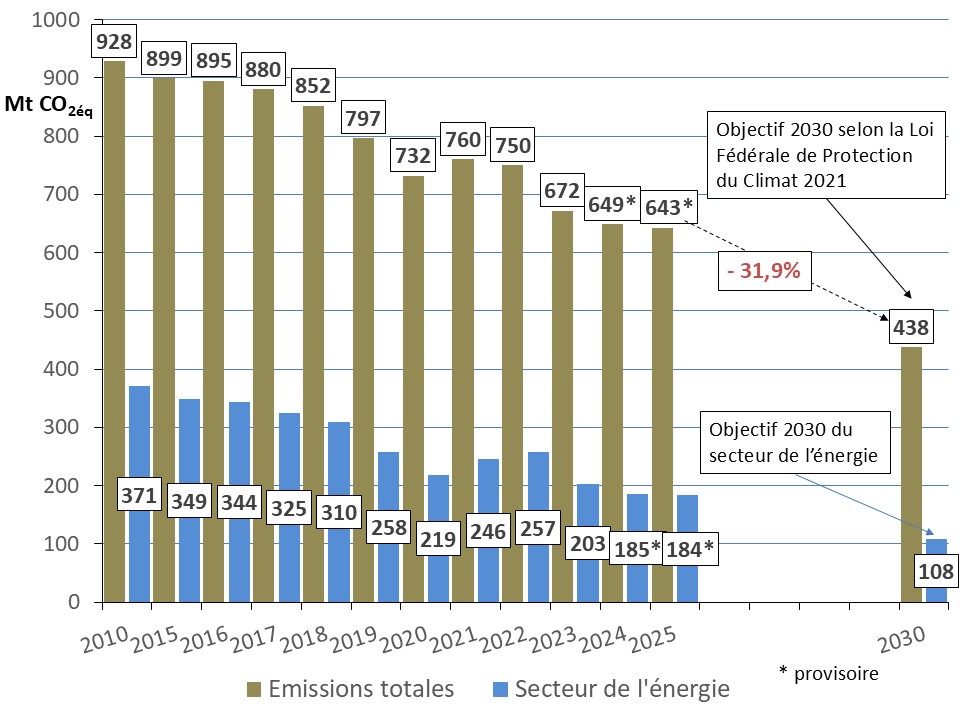 Les données définitives concernant les émissions de gaz à effet de serre pour l’année 2025 seront publiées par l’Agence Fédérale de l’Environnement début 2027.