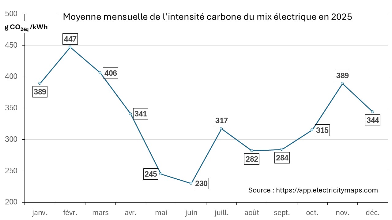 L’évolution de l’intensité carbone au cours de l’année montre bien que la valeur lissée sur l’année n’est pas significative à elle seule. En fin d’automne et en hiver, lorsque la production du photovoltaïque est généralement plus faible, l’intensité carbone peut dépasser les 400 g CO2eq /kWh si cela coïncide avec des épisodes de faible production éolienne comme par exemple en février et mars 2025, cf. figure 16 (Electricity Maps 2026).