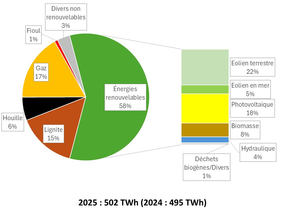 Selon le cabinet AG Energiebilanzen (AGEB 2025b) le volume total d’électricité produit en Allemagne en 2025 atteint 502 TWh bruts (hors STEP) soit une légère augmentation de 1,5% par rapport à 2024 (495 TWh).