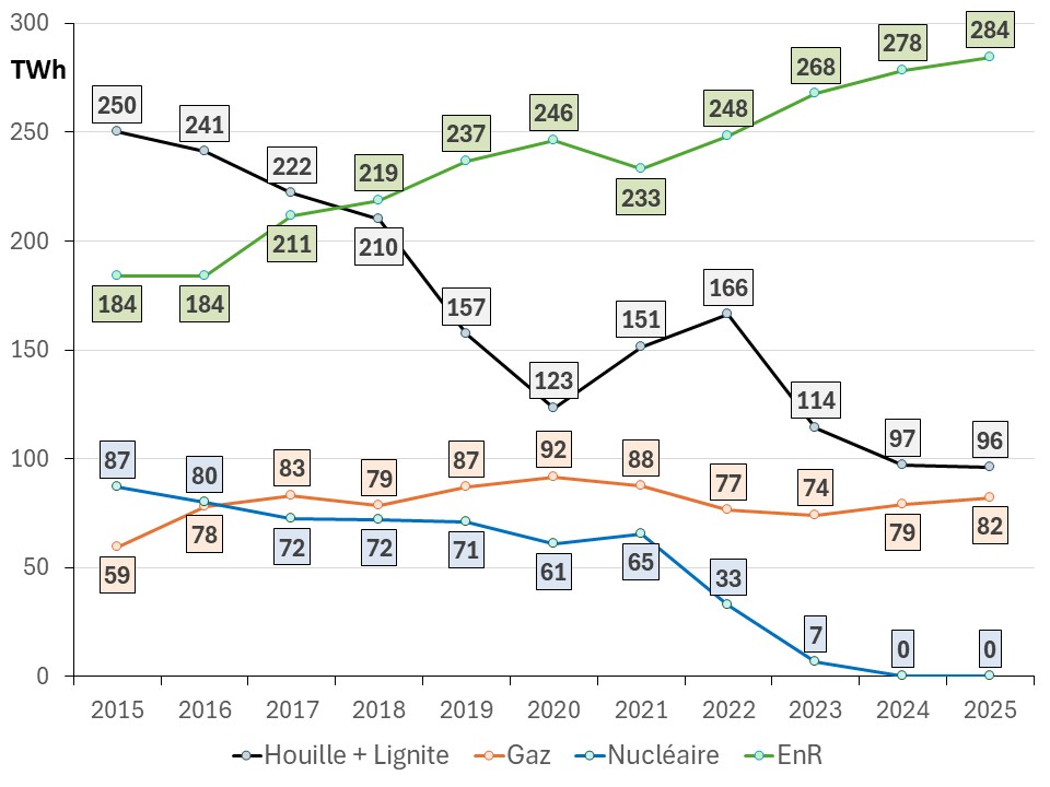 La production du couple houille/lignite a diminué de presque 62% entre 2015 et 2025 et a atteint en 2025 son niveau le plus bas depuis la réunification de l’Allemagne.