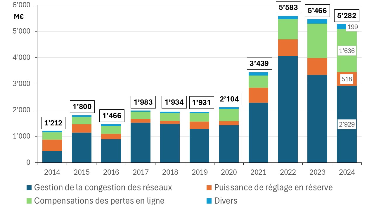 - Le fort développement des énergies renouvelables variables et la lente modernisation des réseaux ont fait exploser les coûts des services système. Ils ont quadruplé en 10 ans et dépassent les cinq milliards d’Euros par an. Le principal facteur de hausse des coûts est la gestion des congestions de réseaux ;
