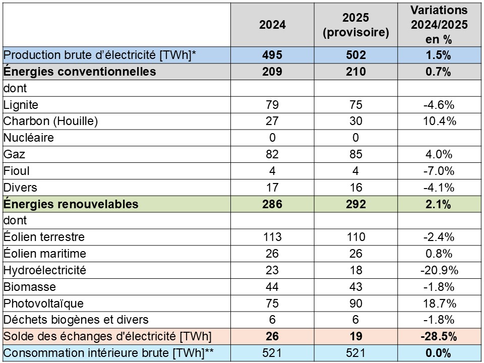 Le tableau 1 détaille la production brute en 2024 et 2025 pour chaque filière du secteur de l’électricité, y compris le solde des échanges transfrontaliers et la consommation intérieure brute hors STEP (AGEB 2025b).