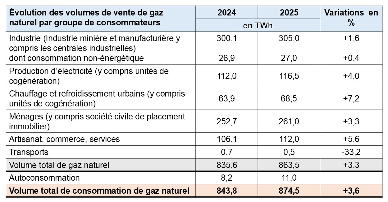 La consommation de gaz naturel a augmenté de 3,6% en 2025 par rapport à 2024 principalement en raison de la hausse de consommation de chaleur et de l’accroissement de la production d’électricité des centrales à gaz (production éolienne inférieure aux attentes par suite des conditions météorologiques défavorables au cours des premiers mois de 2025).
