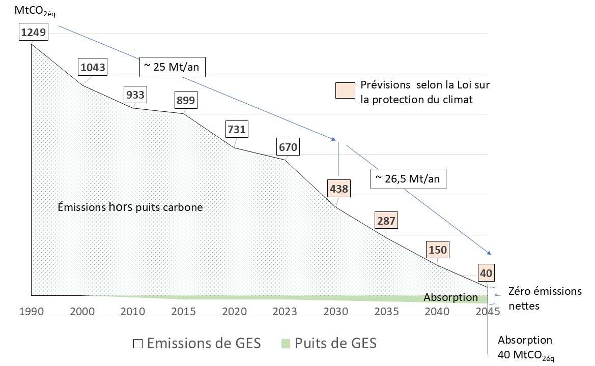Alors que le concept énergétique de 2010 prévoyait encore une réduction de 80% à 95% des émissions de gaz à effet de serre d’ici 2050 par rapport à 1990, la Loi Fédérale sur la Protection du Climat, entrée en vigueur en août 2021, prévoit une réduction des émissions de gaz à effet de serre de 65% d’ici 2030 et de 88% d’ici 2040 par rapport à 1990 avec l’intention d’atteindre la neutralité carbone en 2045 (zéro émission nette).