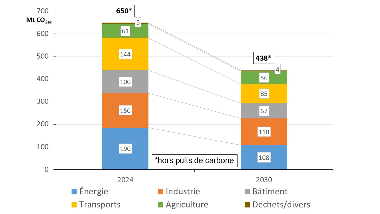 La France table sur une réduction des émissions brutes de GES de 50% d’ici 2030 par rapport à 1990 selon le PNIEC (voir plus haut). Pour tenir l’objectif d’environ 270 Mt CO2éq en 2030, la France devra désormais baisser ses émissions de gaz à effet de serre d’environ 16 Mt CO2éq par an entre 2025 et 2030.