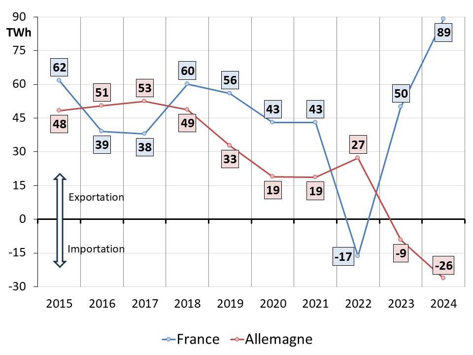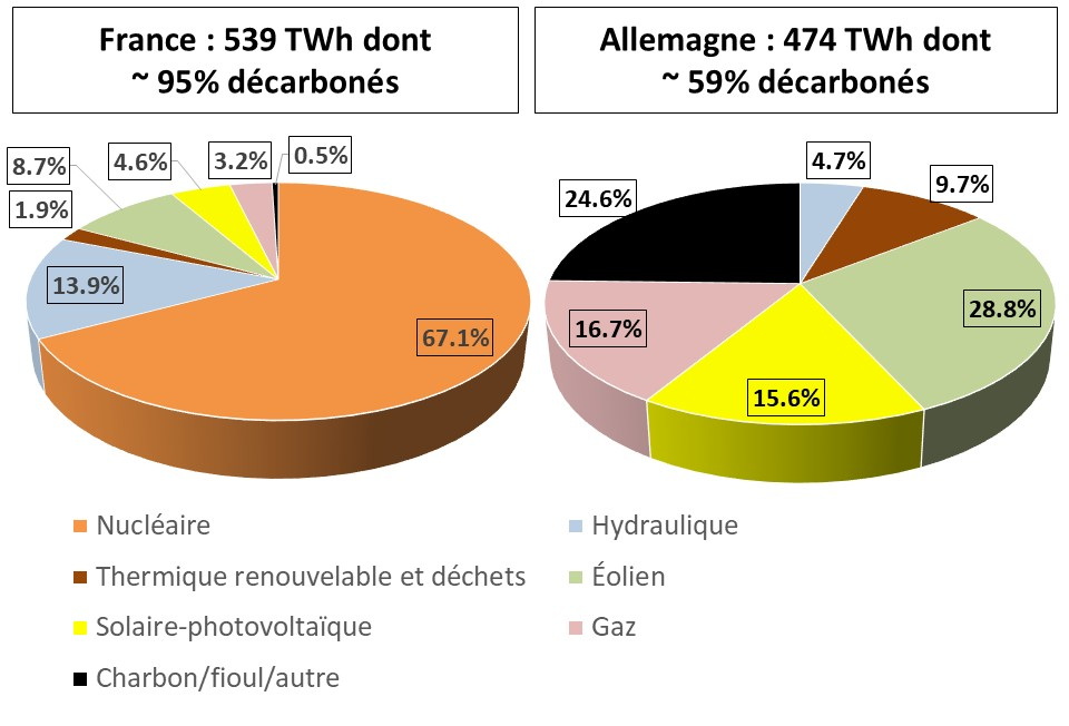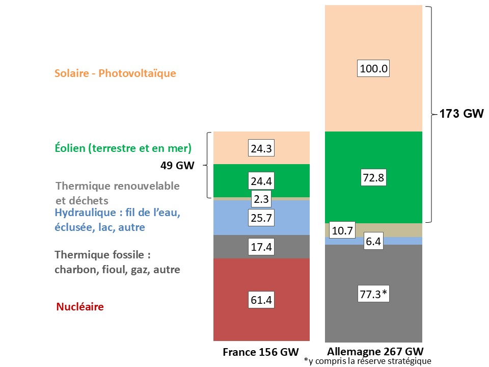 L’Allemagne est sortie du nucléaire et mise sur les énergies renouvelables. La France mise sur le nucléaire (prolongement de réacteurs et augmentation de puissance, au moins six nouveaux réacteurs, et potentiellement aussi des petits réacteurs) et en plus sur le développement des énergies renouvelables.