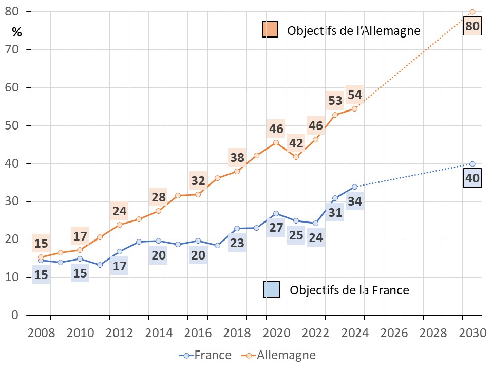 Selon le Code de l’énergie français (voir plus haut) les énergies renouvelables doivent représenter au moins 40 % de la production d’électricité en 2030.