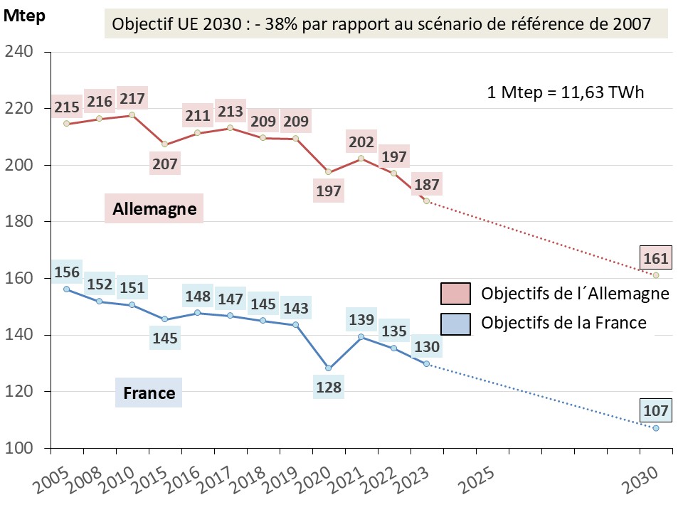 Outre-Rhin, la Loi sur l’efficacité énergétique, approuvée par le parlement allemand en septembre 2023, fixe l’objectif de la consommation finale d’énergie (hors usages non énergétiques) à 1867 TWh ou environ 161 Mtep en 2030, ce qui suppose une réduction de la consommation finale d’énergie d´au moins 26,5% par rapport à 2008.