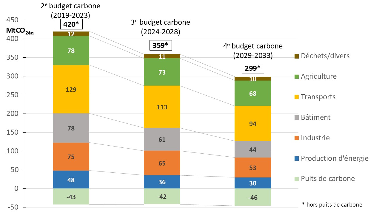 Depuis la rehausse de l’objectif de l’UE à -55% net par rapport à 1990, une mise à jour de la SNBC est en cours (SNBC-3). Le projet de la SNBC-3 propose au total, hors puits de carbone, pour la période 2024 – 2028 un budget moyen provisoire des émissions de gaz à effet de serre de 333 Mt CO2éq, avec une part indicative pour 2024 de 363 Mt CO2éq (hors puits de carbone).