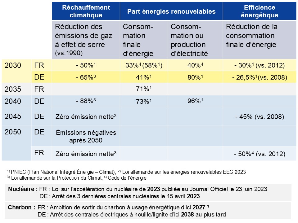 Les deux pays se sont engagés dans une transformation importante de leurs systèmes énergétiques qui s’inscrit dans le développement du marché intérieur et de la transition énergétique européenne. La France vise la neutralité carbone d’ici 2050 et l’Allemagne a l’intention d’atteindre la neutralité carbone en 2045, soit cinq ans plus tôt qu’initialement prévus. Les défis, amplifiés par la crise énergétique née de la guerre en Ukraine, sont importants.