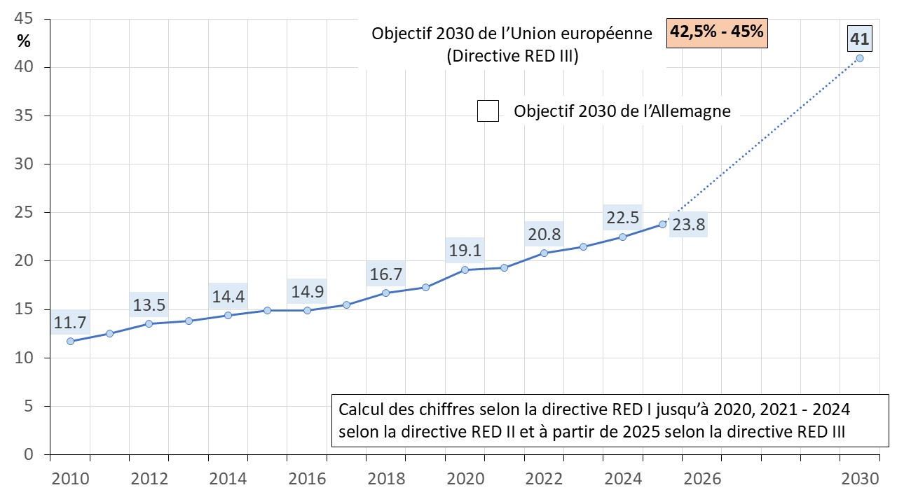 Selon la directive européenne (directive RED III), la part des énergies renouvelables à la consommation finale brute d’énergie a été rehaussée à au moins 42,5% avec l’objectif indicatif de 45% à l’horizon de 2030 (Allemagne Energies 2).