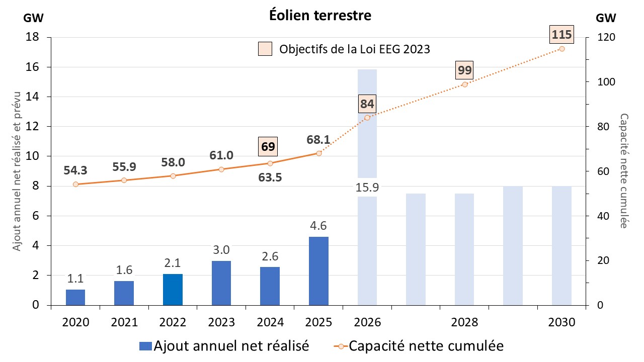 Le parc éolien terrestre s’élève à 68,1 GW fin 2025 (Allemagne Energies 2026b ; UBA 2). L’objectif intermédiaire de la Loi EEG de 69 GW en 2024 a été, avec 63,5 GW réalisés, largement manqué.