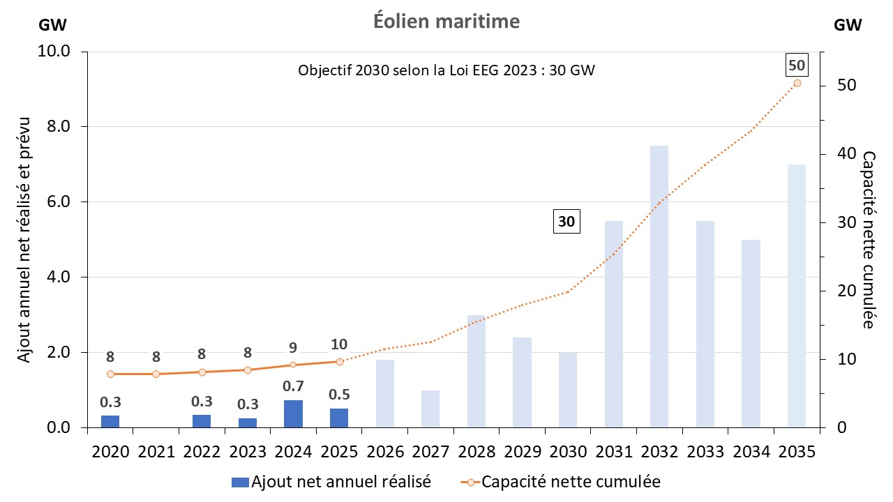 Les objectifs de développement fixés par la loi sur l’éolien maritime (WindSeeG) prévoient que la capacité connectée au réseau doit atteindre au moins 30 GW d’ici 2030 et au moins 40 GW d’ici 2035.