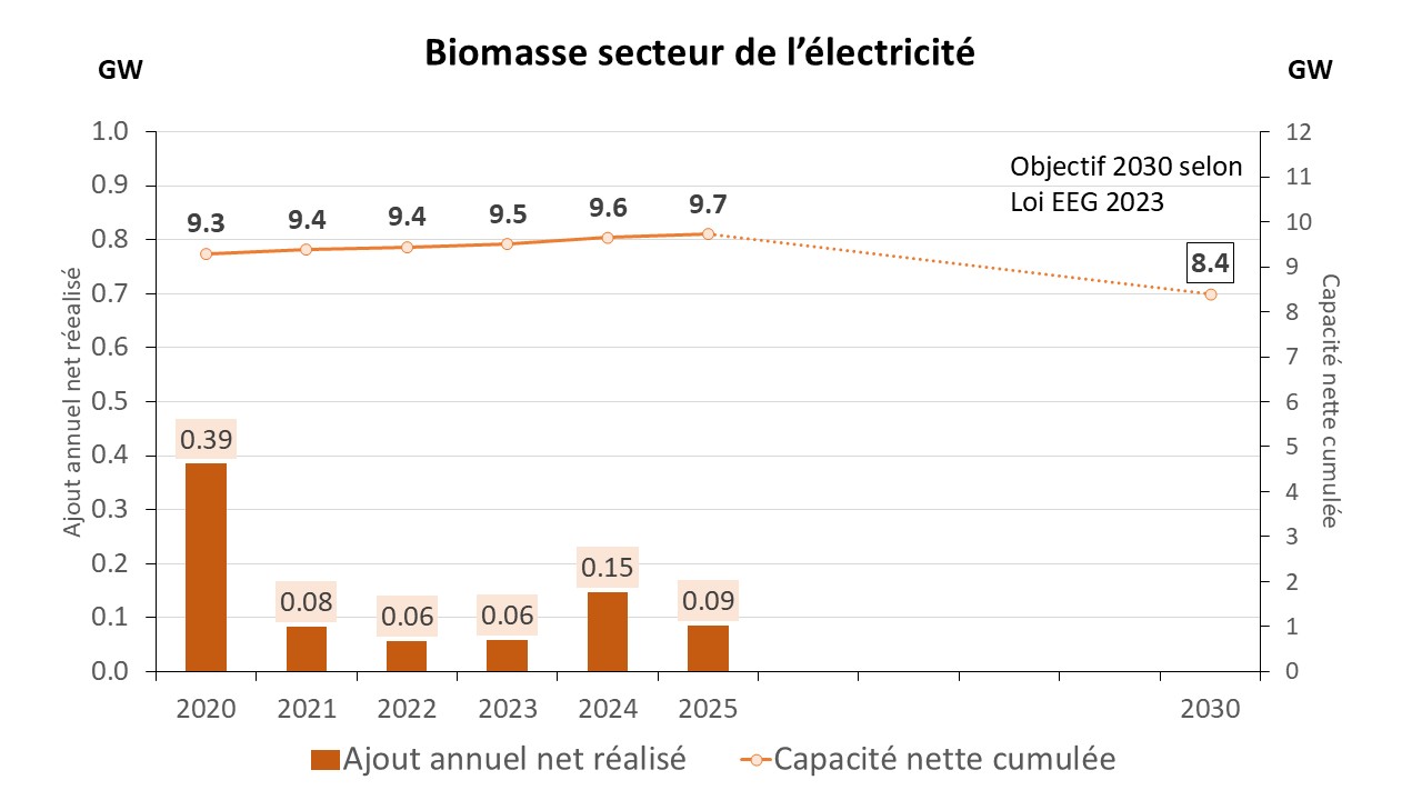 Le parc des centrales à biomasse s’élève à environ 9,7 GW fin 2025 (UBA 2), cf. figure 12.