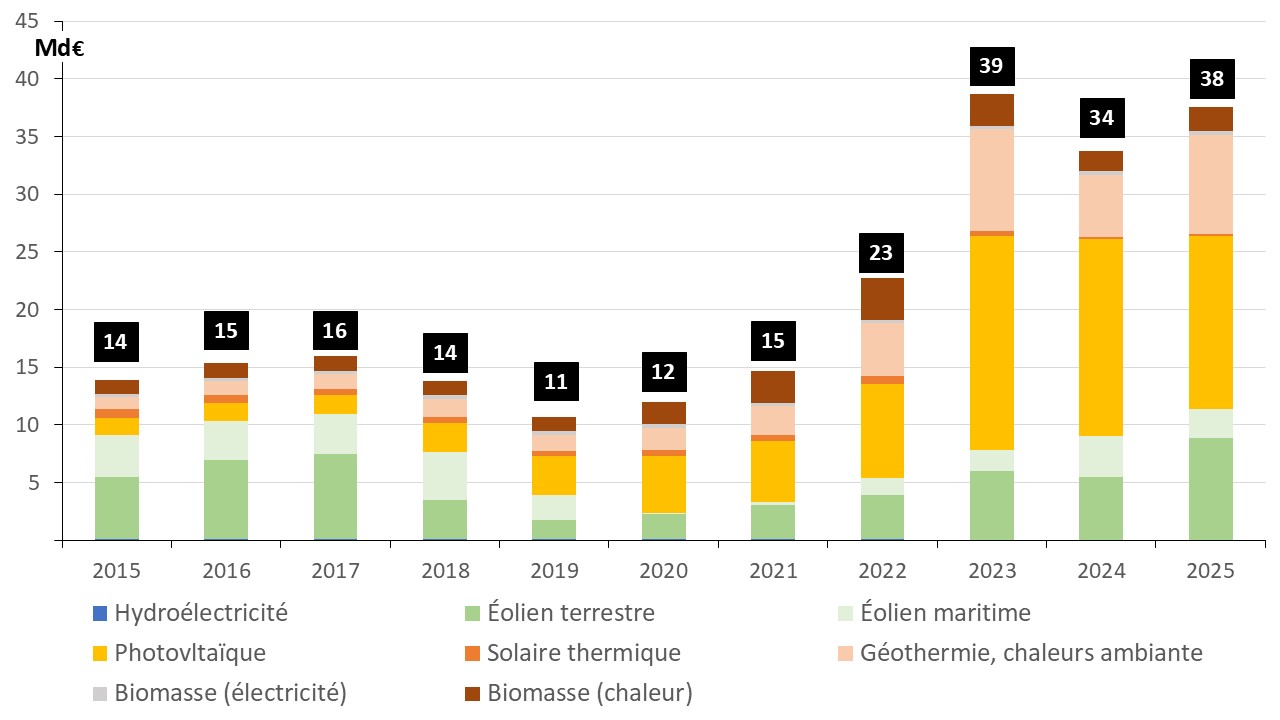 La plus grande partie des investissements (~ 70%) a été destinée aux énergies variables (éolien, photovoltaïque). Entre 2015 et 2025 ont été investis environ 79,5 Md€ dans le photovoltaïque et environ 80,6 Md€ dans l’éolien.
