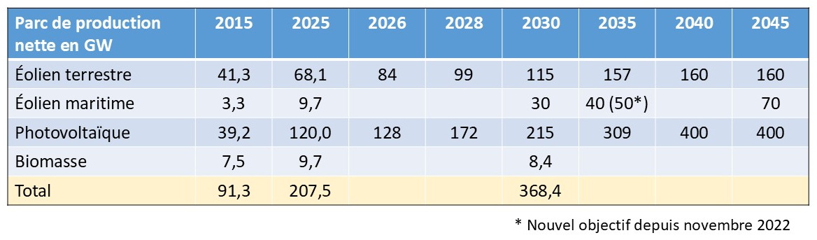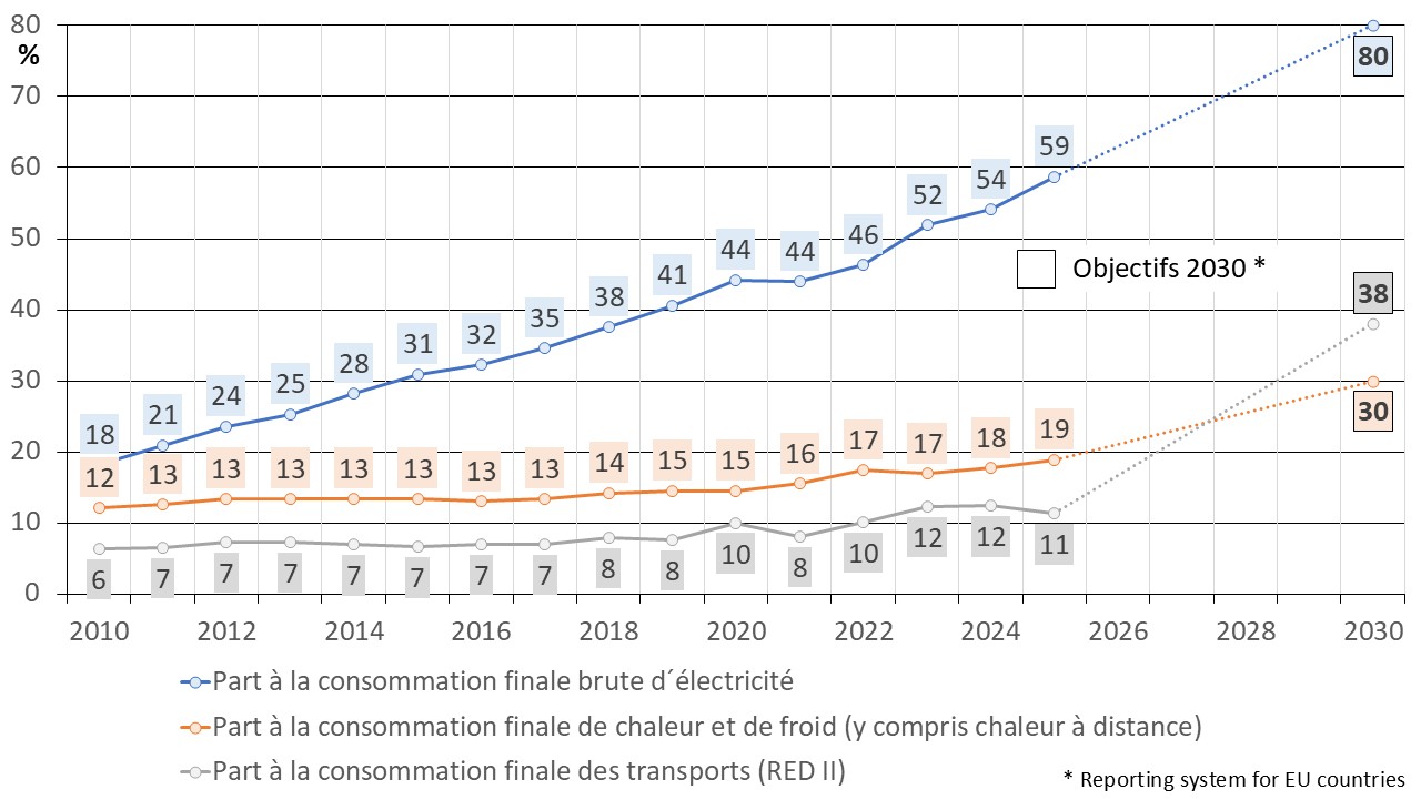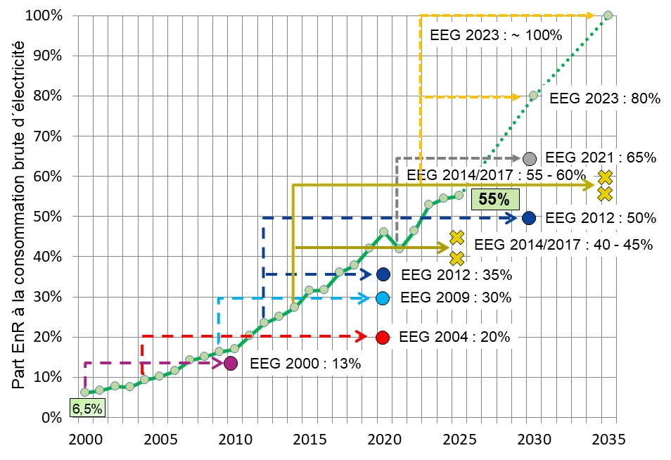 L’objectif à l´horizon de 2035 est un système électrique presque 100% renouvelable (voir plus haut). Pour 2030 l’étape intermédiaire vise 80% renouvelable à la consommation brute d’électricité, soit 600 TWh (voir plus haut). L’objectif est ambitieux et demande une accélération importante du rythme de développement notamment de l’éolien et du photovoltaïque.
