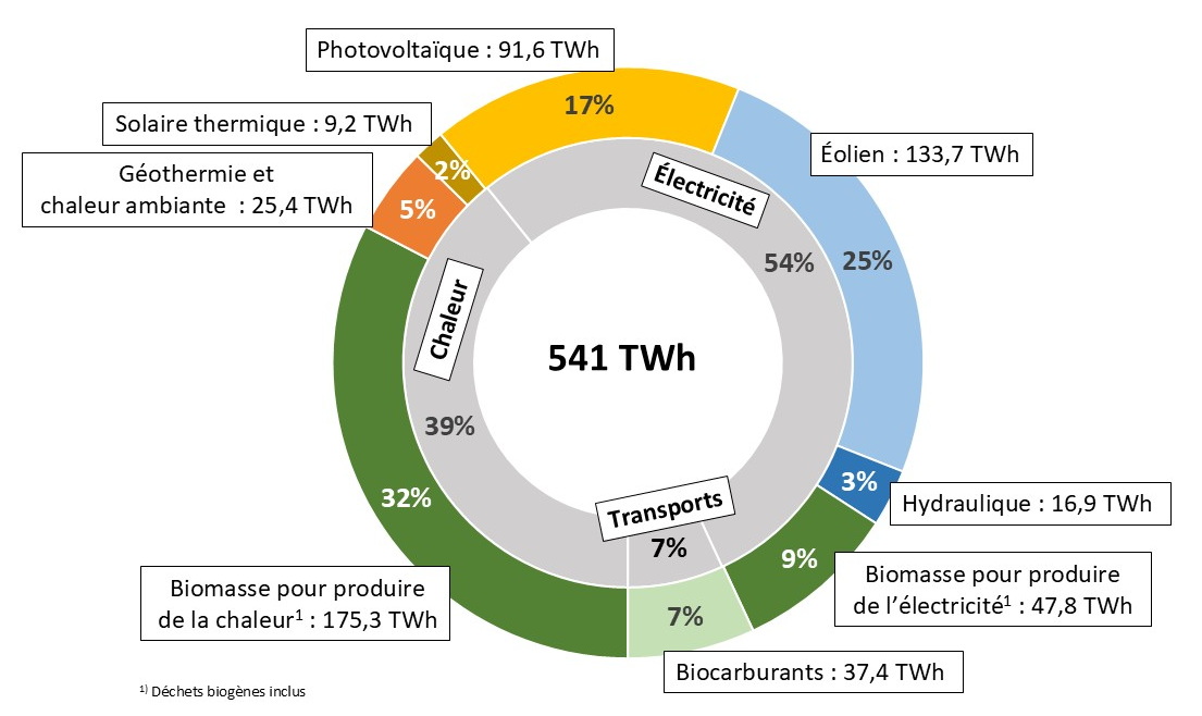 Les bioénergies sont la principale source avec une part de plus de 48% (~ 261 TWh) à la consommation finale d’énergie d’origine renouvelable, en raison de leurs multiples utilisations dans tous les secteurs (sous forme de combustibles solides pour le chauffage, de biocarburants pour les transports ou de biogaz pour la production d’électricité).