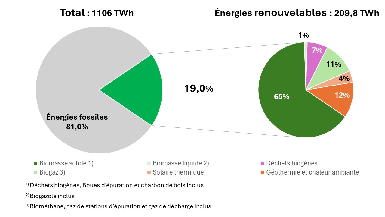 En raison des températures plus froides en 2025, l’utilisation de la chaleur d’origine renouvelable a considérablement augmenté. En 2025, les énergies renouvelables atteignent 209,8 TWh contre 197,3 TWh en 2024.