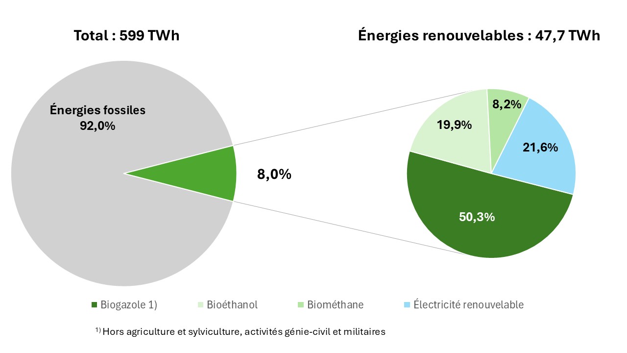 Au total, 47,7 TWh d’origine renouvelable ont été consommés dans les transports en 2025, soit une augmentation de 10% par rapport à 2024 notamment due à la hausse des ventes de biocarburants.