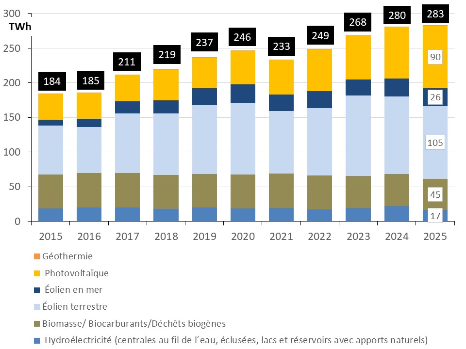 En 2025, la production nette des filières renouvelables, marquée par des conditions de vent défavorables, augmente de 0,7% par rapport à 2024 et passe à 282,5 TWh contre 280,5 TWh en 2024 (UBA 1 ; UBA 2).