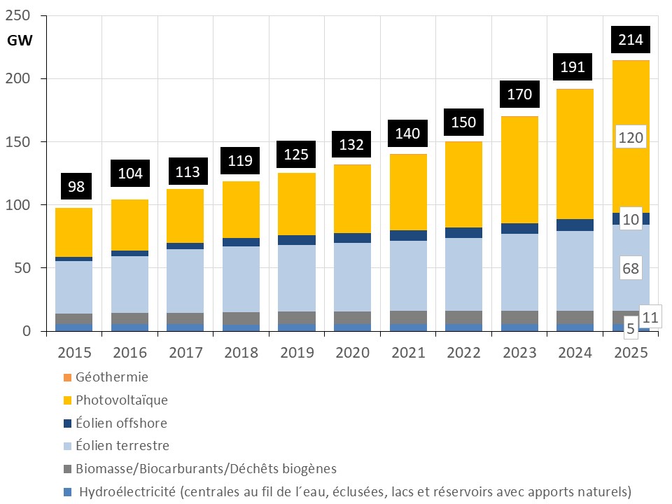 La plus grande partie de l’augmentation des capacité renouvelables est imputée au photovoltaïque. Sa capacité est passée de 39 GW en 2015 à 120 GW en 2025.