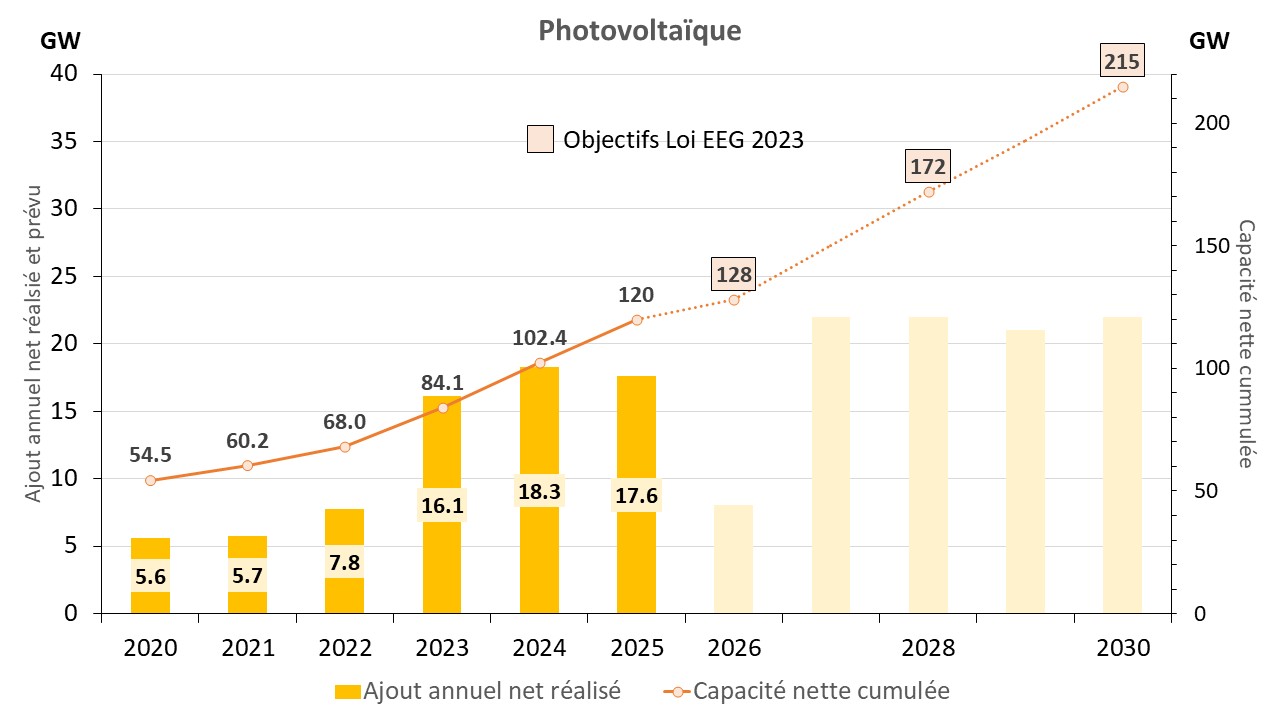 La Loi sur la promotion des énergies renouvelables (EEG 2023) prévoit une réduction nette de la capacité à 8,4 GW en 2030.