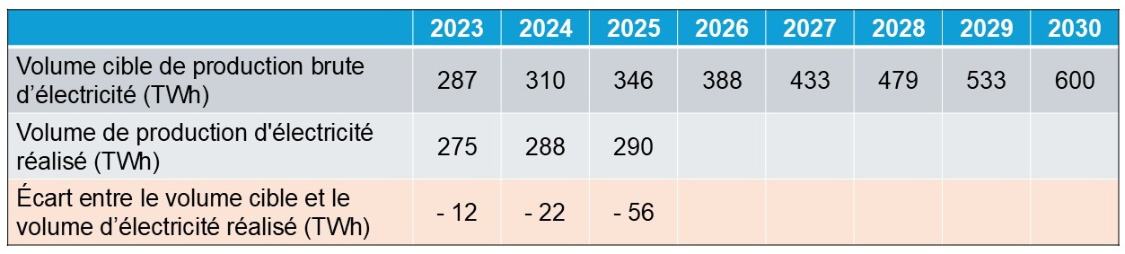 La Loi (EEG 2023, §4a) a fixé des objectifs indicatifs intermédiaires pour les volumes de production d’électricité à partir de sources renouvelables afin vérifier si le développement est conforme au trajet cible pour atteindre l’objectif visé à l’horizon de 2030, soit une part de 80% (600 TWh) à la consommation brute d’électricité.