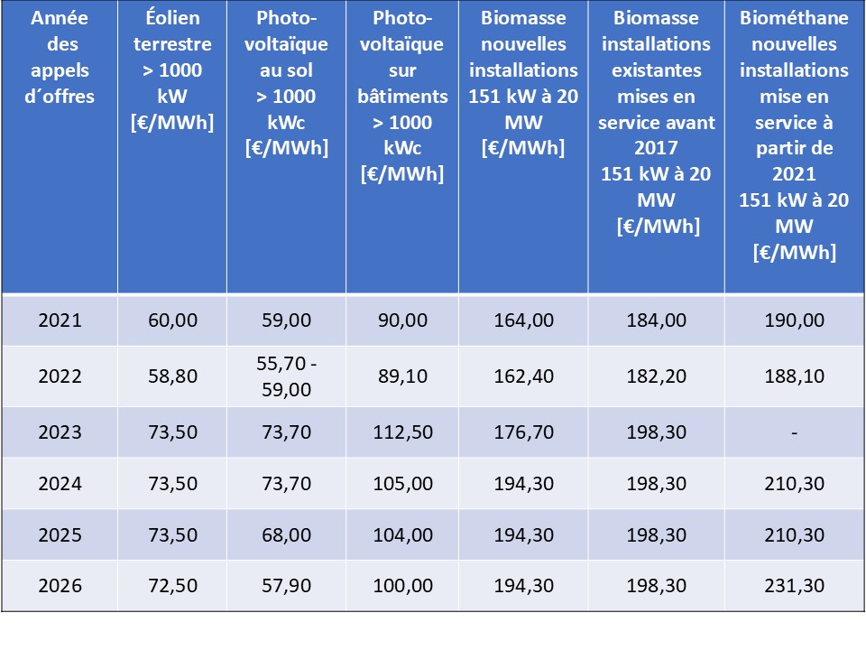 Depuis 2017, le complément de rémunération appelé « rémunération de référence » est déterminés par appels d’offres, sauf les installations de petite taille ou les installations pilotes. Les mécanismes incitatifs mis en place sont spécifiques à chaque filière et font l’objet d’adaptations périodiques pour tenir compte des évolutions techniques et économiques par l’introduction d’un plafond de rémunération de référence. Le tableau 3 montre, à titre d’exemple, l’évolution des montants plafonds pour des filières renouvelables soumises aux appels d’offres (BNetzA 1).