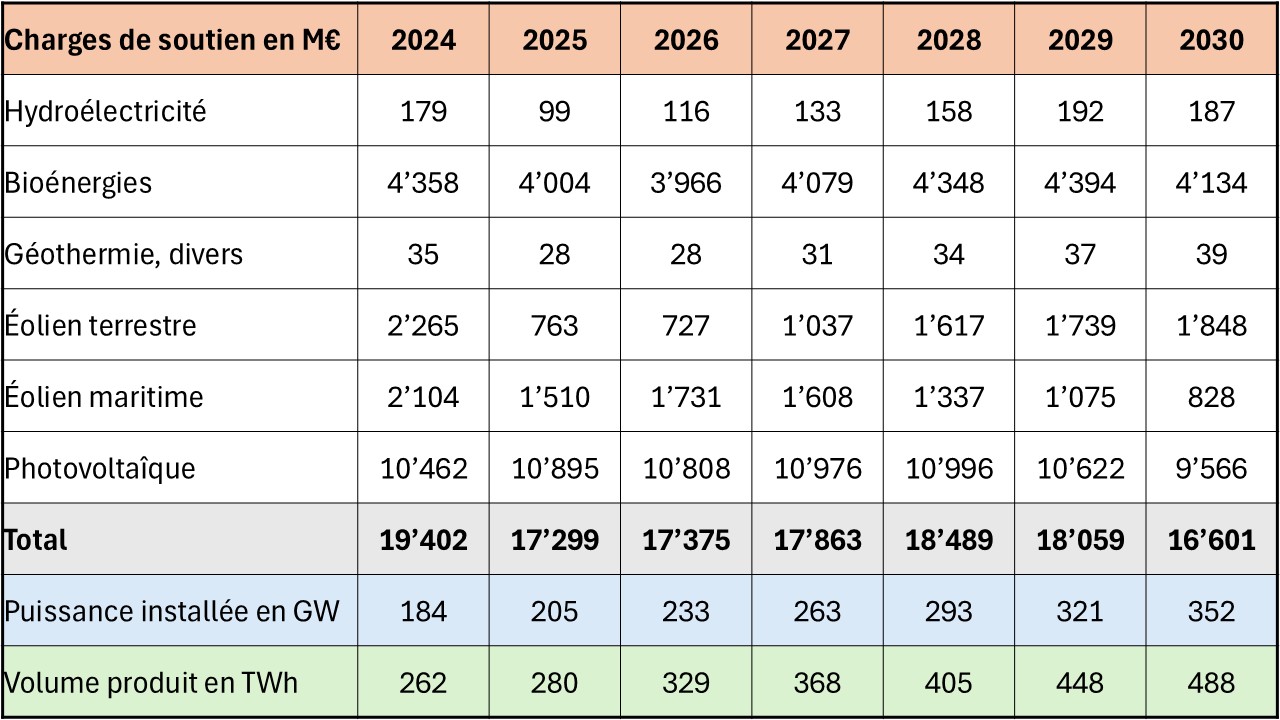 Le tableau 4 ci-dessous présente pour les années 2024 – 2030 l’évolution attendue des charges de soutien aux énergies renouvelables qui doivent être compensées. Source : Institut d’énergie de Leipzig (IE Leipzig 2025).