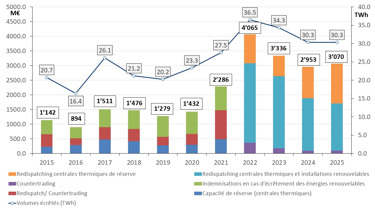 Selon les données provisoires du régulateur (BNetzA 2), les coûts de la gestion des congestions du réseau s’élevaient à 3 071 millions d’euros en 2025 (2024 : 2 954 millions d’euros), soit une augmentation d’environ 4%.