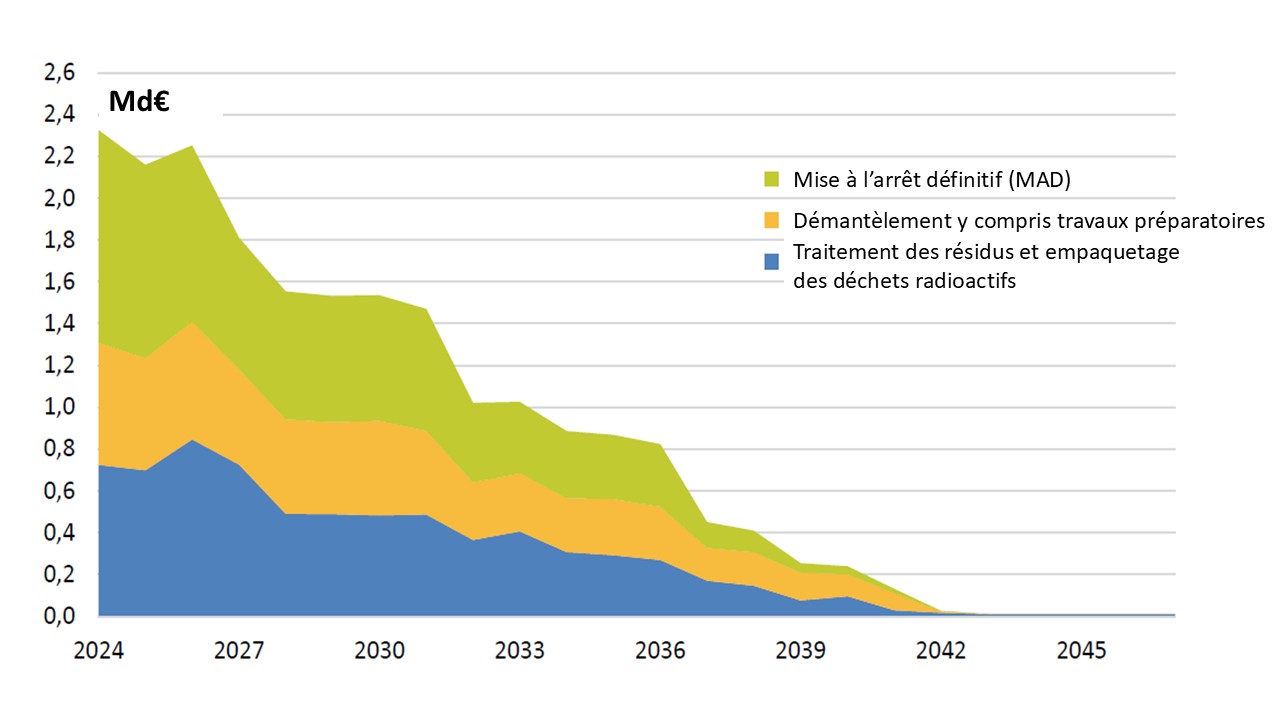 Selon le dernier rapport publié en novembre 2024, les provisions des énergéticiens seraient suffisantes (BAFA 1). Les provisions enregistrées dans leurs bilans s’élèvent à 19,3 Md€ au 31.12.2023 (fin 2022 : 20,5 Md€) pour la déconstruction des 23 centrales.