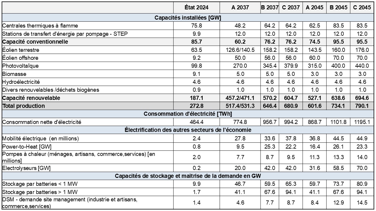 En tenant compte de l´électrification accrue dans le domaine de la mobilité (véhicules électriques, transport ferroviaire), l´habitat (pompes à chaleur), la production de batteries, le numérique et la génération d´hydrogène par électrolyse, le gouvernement sortant avait estimé la consommation brute à 750 TWh en 2030. Environ 600 TWh, soit 80% de la consommation d´électricité, devraient provenir des énergies renouvelables et notamment de l´éolien et du photovoltaïque. Un système électrique presque neutre en carbone est visé à l´horizon de 2035.