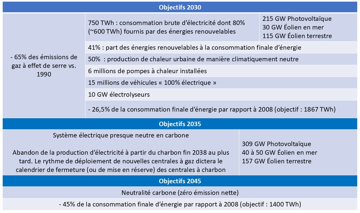 Le tableau résume les principaux objectifs actuels à l’horizon de 2030, 2035 et 2045.